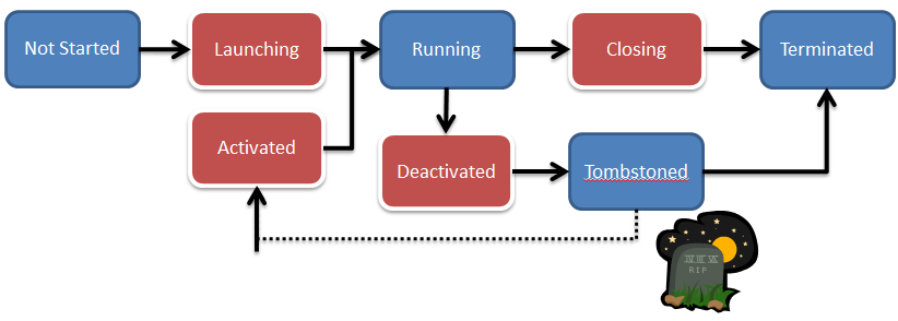 A little tricky at first glance, but with a bit of explanation it's fairly simple. The top row is essentially a run-to-exit flow of processes. From the running state it becomes a little more interesting. An application can be deactivated in a number of ways; text message, phone call, user hitting start, user searching. Unless you're lucky enough to partner with Microsoft to allow running in the background, your process is killed. It doesn't run in the background and, unless you've handled it, the transient data on screen is gone too. BUT the screen is saved on the 'Application Back Stack'. So if the user then hits the back button on the phone, they'll return to the last screen they were on in your application.
