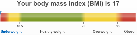 This year I'm going to try some self improvement, at least, I'd see it as improvement. Recently I checked out my BMI on the NHS tool. I did this to stop speculating as to what my weight should be and actually find out a hard value. Although many are sceptical about the relevance of BMI to them, I think it's quite relevant to me. So my BMI turned out to be 17. A fair way outside the 'healthy weight' category of 18.5-25 to the point where my indicator was close to the edge of the scale. After playing for a bit I discovered I needed to put on a stone to tip into the 'Healthy weight' section.